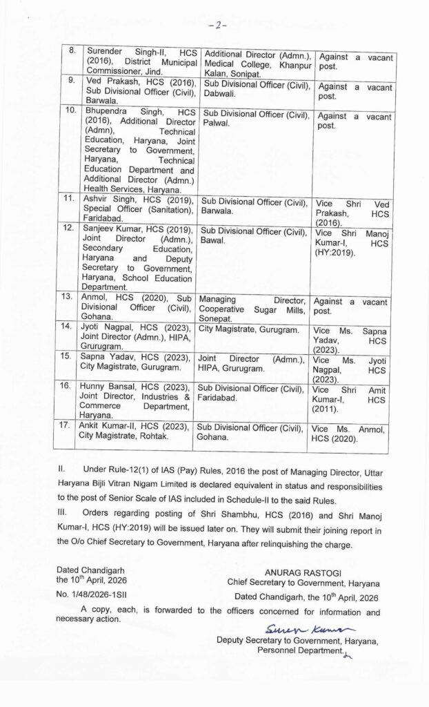 चंडीगढ़, 10 अप्रैल 2026 – हरियाणा सरकार ने प्रशासनिक फेरबदल करते हुए शुक्रवार को बड़े स्तर पर IAS और HCS अधिकारियों के तबादले व नियुक्तियां कर दीं। मुख्य सचिव अनुराग रस्तोगी द्वारा जारी आदेशों के अनुसार कुल 17 अधिकारियों को तत्काल प्रभाव से नई जिम्मेदारियां सौंपी गई हैं।