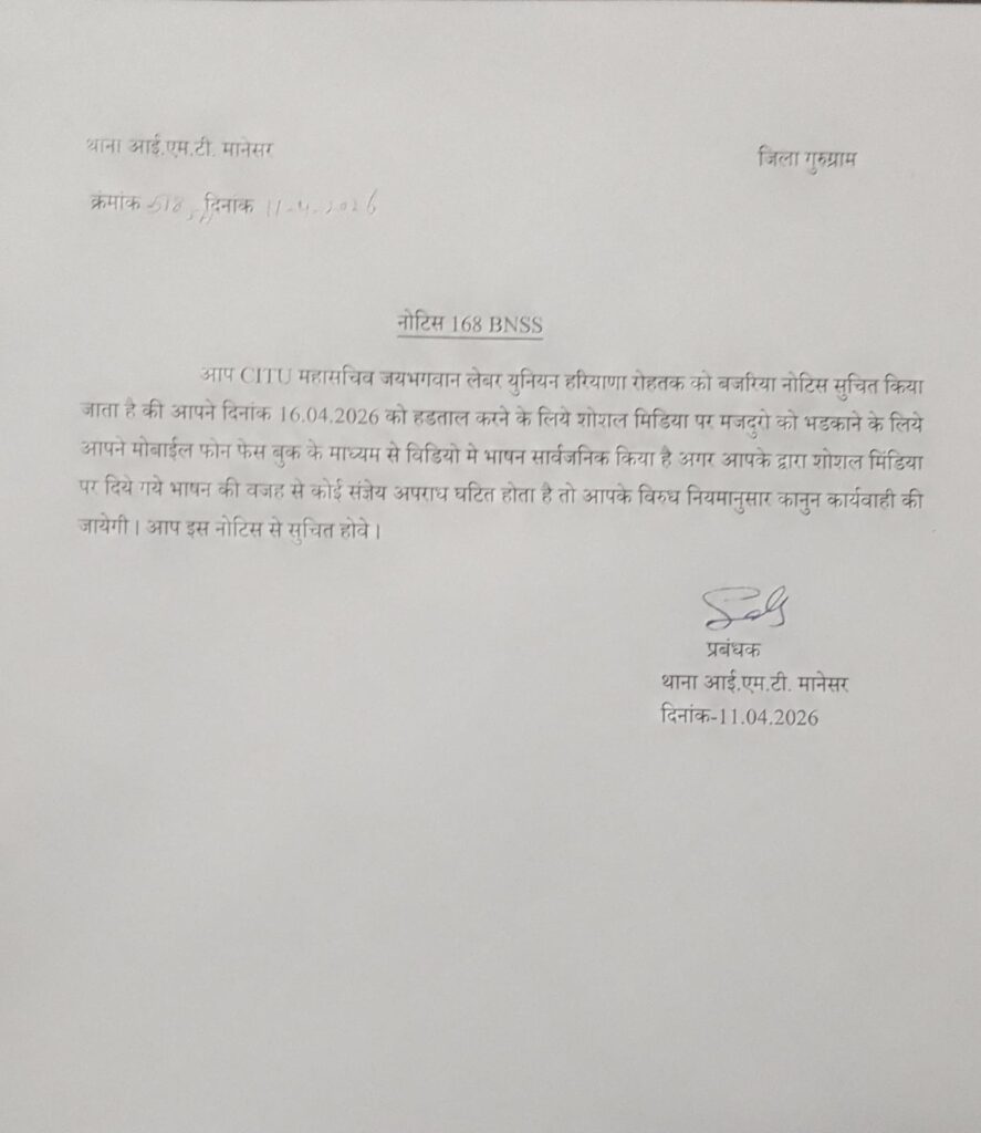 गुड़गांव, 12 अप्रैल 2026। मानेसर में मजदूर आंदोलन को लेकर एक बार फिर तनाव का माहौल बनता दिख रहा है। ट्रेड यूनियन सीटू (CITU) ने मानेसर पुलिस द्वारा उसके नेताओं को नोटिस जारी किए जाने को “बौखलाहट का प्रदर्शन” बताया है। संगठन ने स्पष्ट किया है कि वह मजदूर अधिकारों की रक्षा के लिए अपने संघर्ष से पीछे नहीं हटेगा।