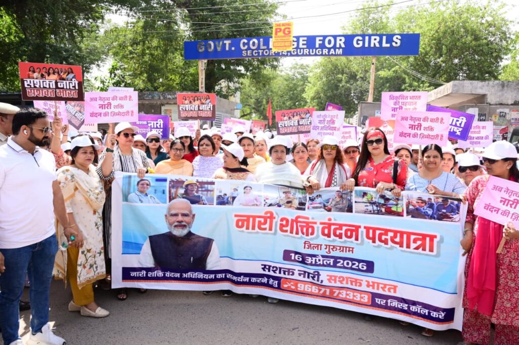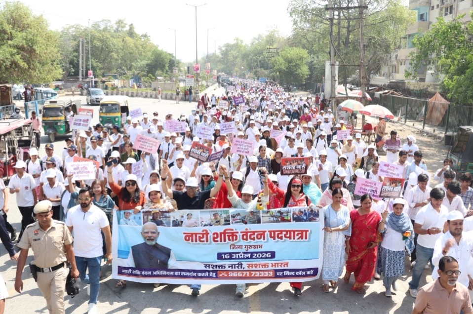 गुरुग्राम, 16 अप्रैल- नारी शक्ति वंदन अधिनियम के समर्थन में गुरुवार को जिले में महिलाओं द्वारा नारी शक्ति वंदन संकल्प यात्रा निकाली गई। यह यात्रा कल्याणी हॉस्पिटल से शुरू होकर अग्रसेन चौक तक निकाली गई। यात्रा का उद्देश्य महिलाओं को उनके अधिकारों के प्रति जागरूक करना और 33 प्रतिशत महिला आरक्षण के समर्थन में संदेश देना रहा। सफेद टी-शर्ट और कैप पहने महिलाओं ने हाथों में तख्तियां, पोस्टर और बैनर लेकर नारे लगाते हुए अपनी भागीदारी दर्ज कराई।
