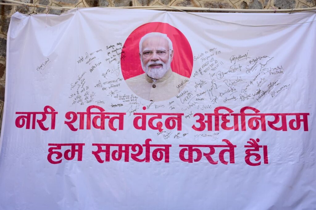 नारी शक्ति वंदन संकल्प यात्रा के दौरान आयोजित हस्ताक्षर अभियान में महिलाओं ने उत्साहपूर्वक भाग लिया। बड़ी संख्या में उपस्थित महिलाओं ने ‘नारी शक्ति वंदन अधिनियम’ के समर्थन में हस्ताक्षर करते हुए इसे महिलाओं के अधिकारों और सशक्तिकरण की दिशा में महत्वपूर्ण कदम बताया। महिलाओं ने कहा कि 33 प्रतिशत आरक्षण से उन्हें राजनीति में अपनी भागीदारी बढ़ाने का अवसर मिलेगा और वे समाज के विकास में अधिक प्रभावी भूमिका निभा सकेंगी।