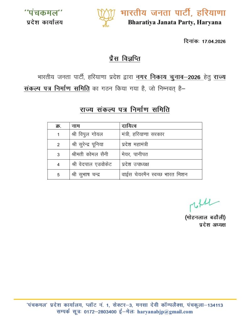 चंडीगढ़/पंचकूला, 17 अप्रैल 2026 – भारतीय जनता पार्टी (हरियाणा) ने आगामी नगर निकाय चुनाव–2026 को लेकर अपनी तैयारियां तेज करते हुए राज्य स्तर पर संकल्प पत्र निर्माण समिति का गठन किया है। पार्टी द्वारा जारी प्रेस विज्ञप्ति में समिति के गठन की जानकारी दी गई।