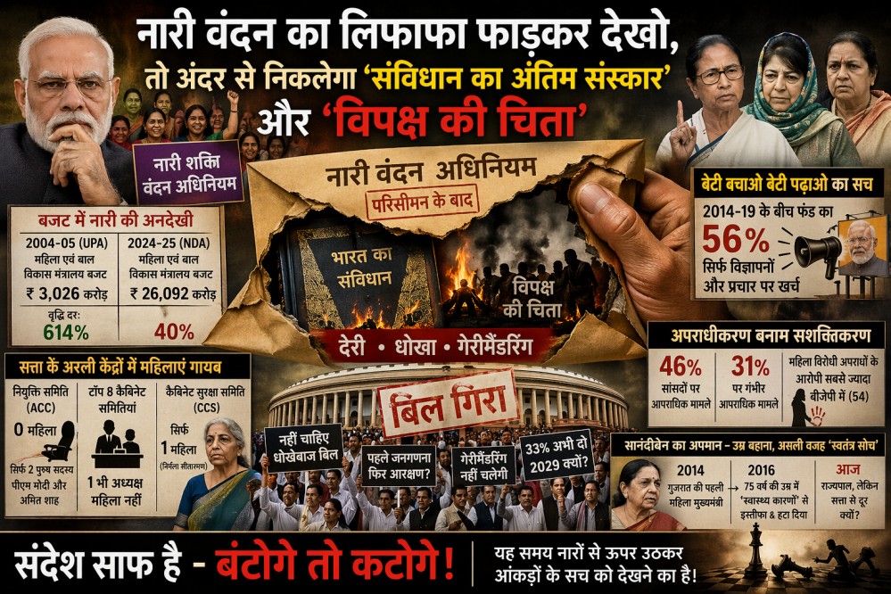 “नारी वंदन का लिफाफा फाड़कर देखो, तो अंदर से निकलेगा ‘संविधान का अंतिम संस्कार’ और ‘विपक्ष की चिता’।”