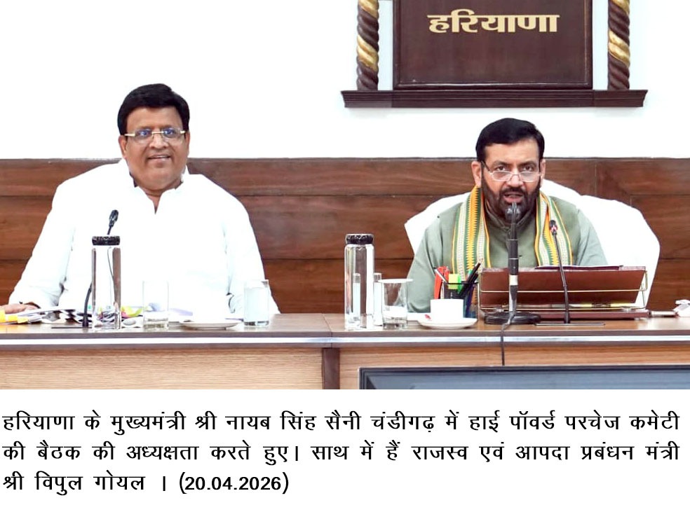 चण्डीगढ, 20 अप्रैल – हरियाणा के मुख्यमंत्री श्री नायब सिंह सैनी की अध्यक्षता में हाई पावर परचेज कमेटी की बैठक हुई। बैठक में तीन एजेंण्डे रखे गए जिसमें से दो एजेण्डों को अंतिम रूप दिया गया।