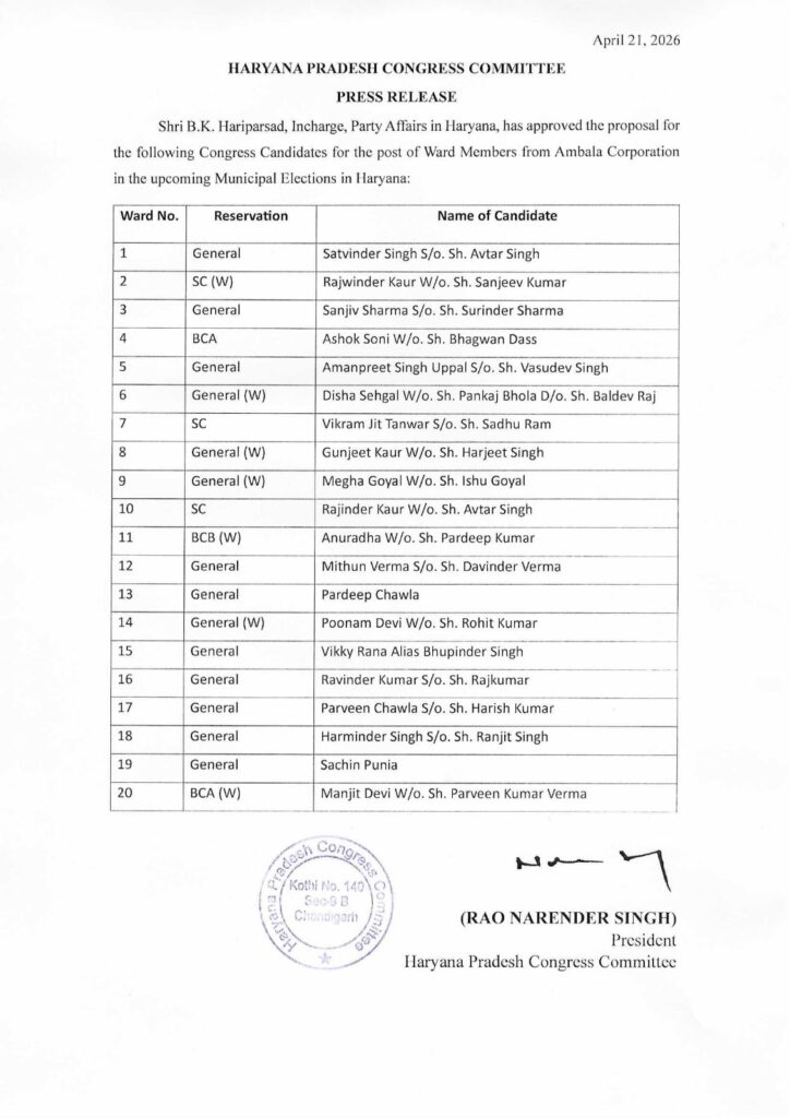 अंबाला, 21 अप्रैल 2026 – अंबाला। हरियाणा प्रदेश कांग्रेस कमेटी ने आगामी नगर निगम चुनावों को लेकर अंबाला के 20 वार्डों के लिए अपने उम्मीदवारों की सूची जारी कर दी है। यह सूची हरियाणा मामलों के प्रभारी बी. के. हरिप्रसाद की मंजूरी के बाद जारी की गई है।