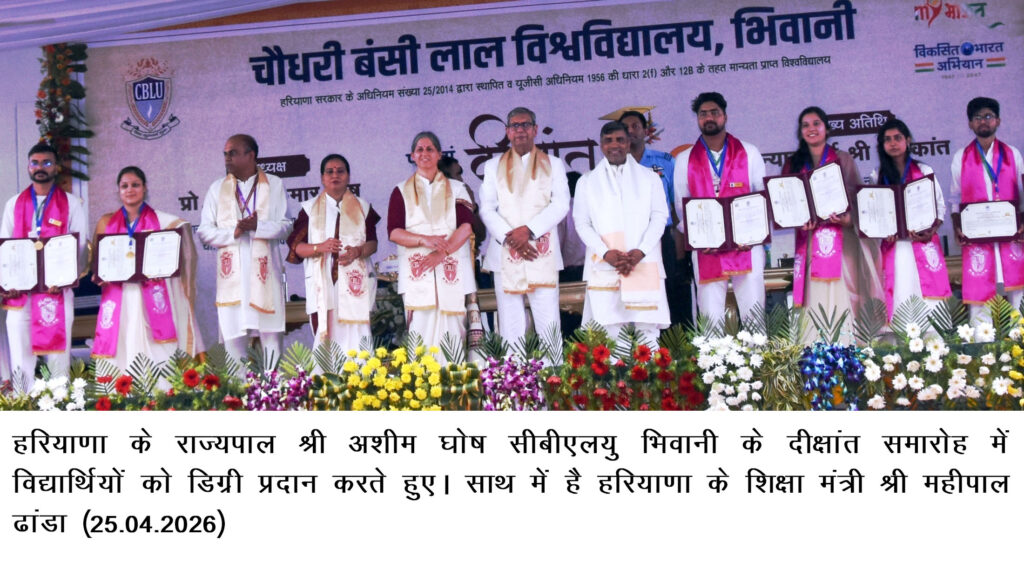 चण्डीगढ, 25 अप्रैल- चौ. बंसीलाल विश्वविद्यालय परिसर के पांचवें दीक्षांत समारोह में हरियाणा के राज्यपाल प्रो. असीम कुमार घोष ने अध्यक्षता की तथा भारत के सर्वोच्च न्यायालय के मुख्य न्यायाधीश न्यायमूर्ति सूर्यकांत बतौर मुख्य अतिथि के रूप में शामिल हुए। दीक्षांत समारोह में पंजाब एवं हरियाणा उच्च न्यायालय के मुख्य न्यायाधीश शील नागू, राज्यपाल की धर्मपत्नी श्रीमती मित्रा घोष भी मौजूद रहे।