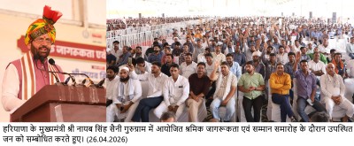 चंडीगढ़, 26 अप्रैल- हरियाणा के मुख्यमंत्री श्री नायब सिंह सैनी ने कहा कि प्रधानमंत्री श्री नरेंद्र मोदी द्वारा वर्ष 2047 तक ‘विकसित भारत’ के निर्माण का जो लक्ष्य निर्धारित किया गया है, उसकी प्राप्ति में श्रमिक वर्ग की भूमिका सबसे महत्वपूर्ण है। उन्होंने कहा कि देश और प्रदेश की अर्थव्यवस्था की मजबूती श्रमिकों की मेहनत पर आधारित है और इसी के बल पर भारत विकसित राष्ट्र बनने की दिशा में तेजी से आगे बढ़ रहा है।